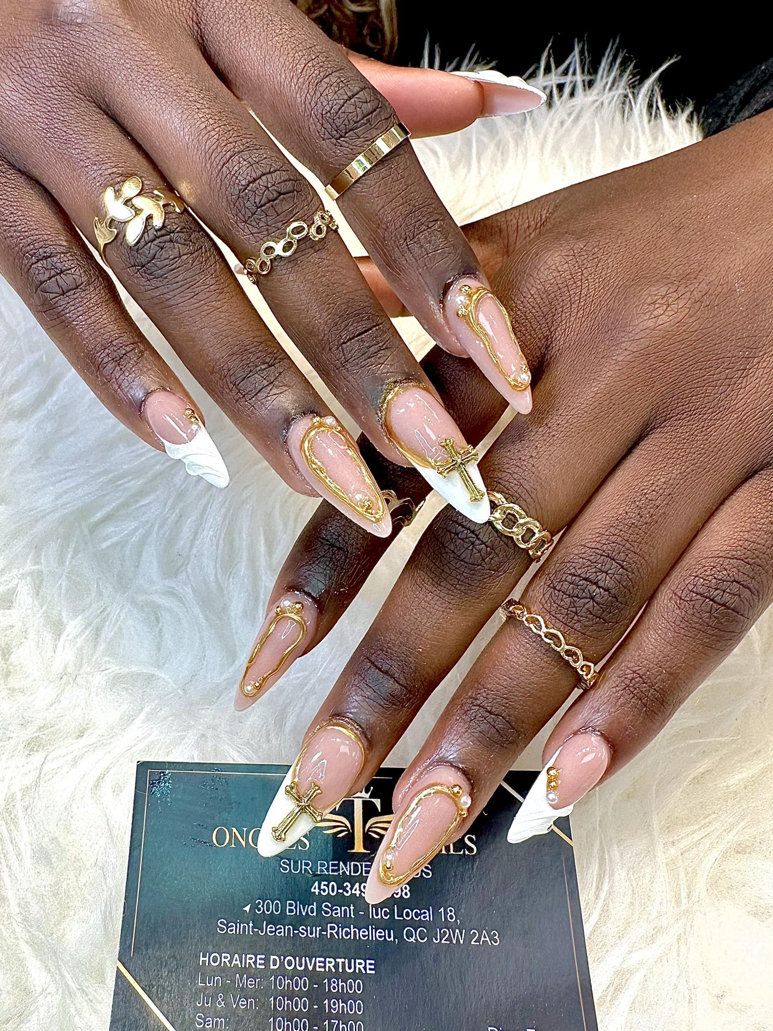 Điểm nhấn nổi bật là charm thánh giá vàng ✝️, kết hợp cùng đường vân kim loại uốn lượn và ngọc trai nhỏ 🤍, mang hơi hướng royal – jewelry nail 💎. Tổng thể mẫu nail giống như những món trang sức vàng thu nhỏ trên móng, vừa cá tính vừa cực kỳ sang chảnh.
