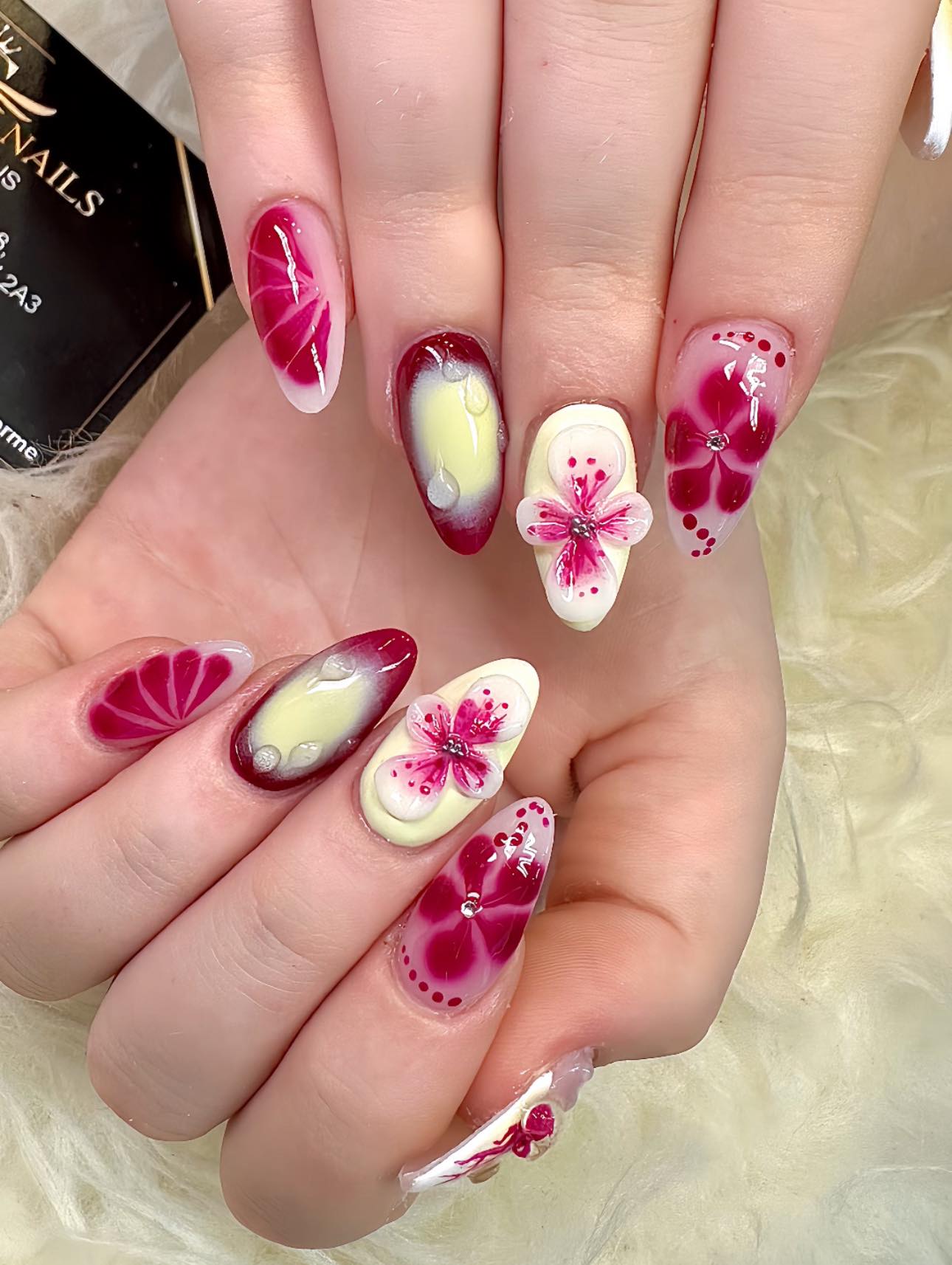 💅 Mẫu hoa 3D nghệ thuật cực nổi, tone hồng – đỏ rượu vang, kết hợp tạo hình cánh hoa nổi và các chi tiết chấm bi viền tinh tế 🌸🎨