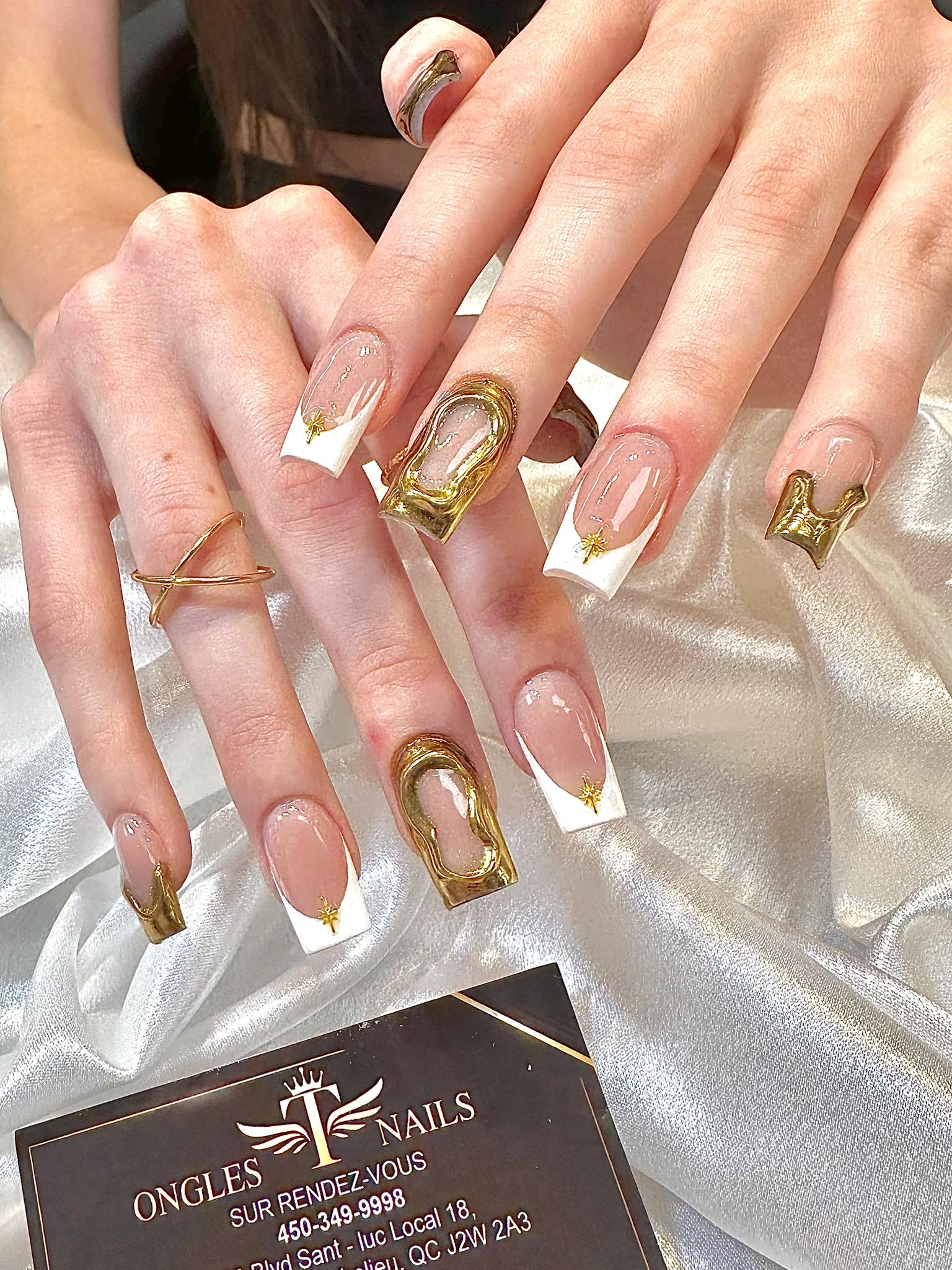 Mẫu nail Golden Frame French Luxe mang phong cách sang trọng – thời thượng – đậm chất high fashion 💎. Nền móng nude hồng trong bóng ✨ giúp tôn da và tạo cảm giác sạch sẽ, tinh tế. Thiết kế nổi bật với French đầu móng trắng sữa 🤍 kết hợp đính charm ngôi sao vàng nhỏ ⭐, tạo điểm nhấn nhẹ nhàng nhưng cuốn hút.
