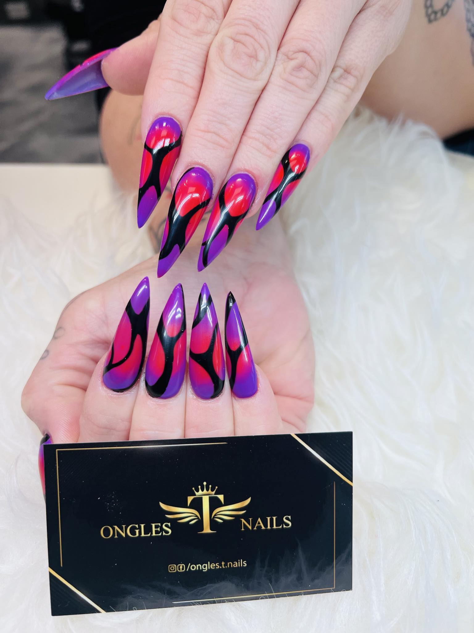 Thiết kế nổi bật với tông tím – đỏ rực rỡ, kết hợp cùng đường nét đen uốn lượn mạnh mẽ, tạo nên hiệu ứng thị giác ấn tượng và đầy sức sống 🎨✨. Dáng móng dài nhọn tôn lên vẻ quyến rũ, quyền lực và đậm chất thời trang, dành riêng cho những cô nàng yêu thích phong cách nổi bật và táo bạo 💋💫.